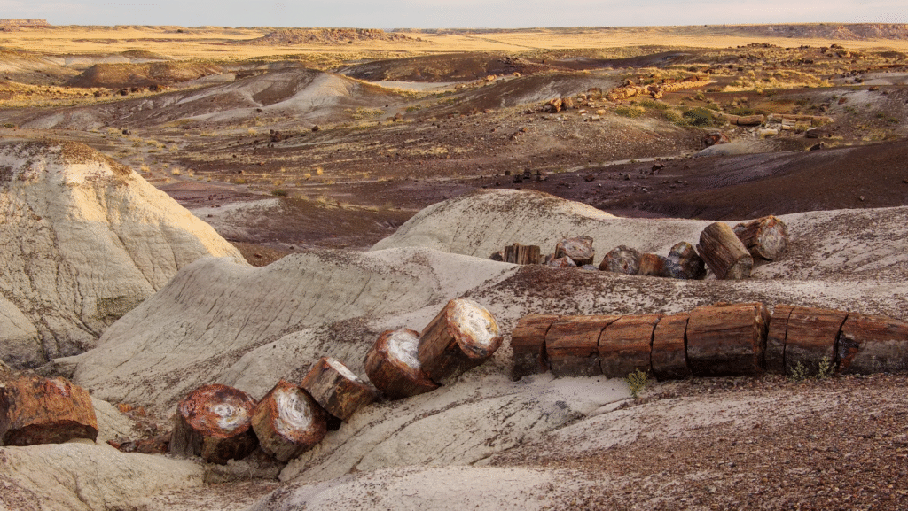 Volcanic ash buried the fallen logs, and over time, silica-rich groundwater replaced the wood with quartz crystals, turning them into those rainbow-hued petrified logs you see today.